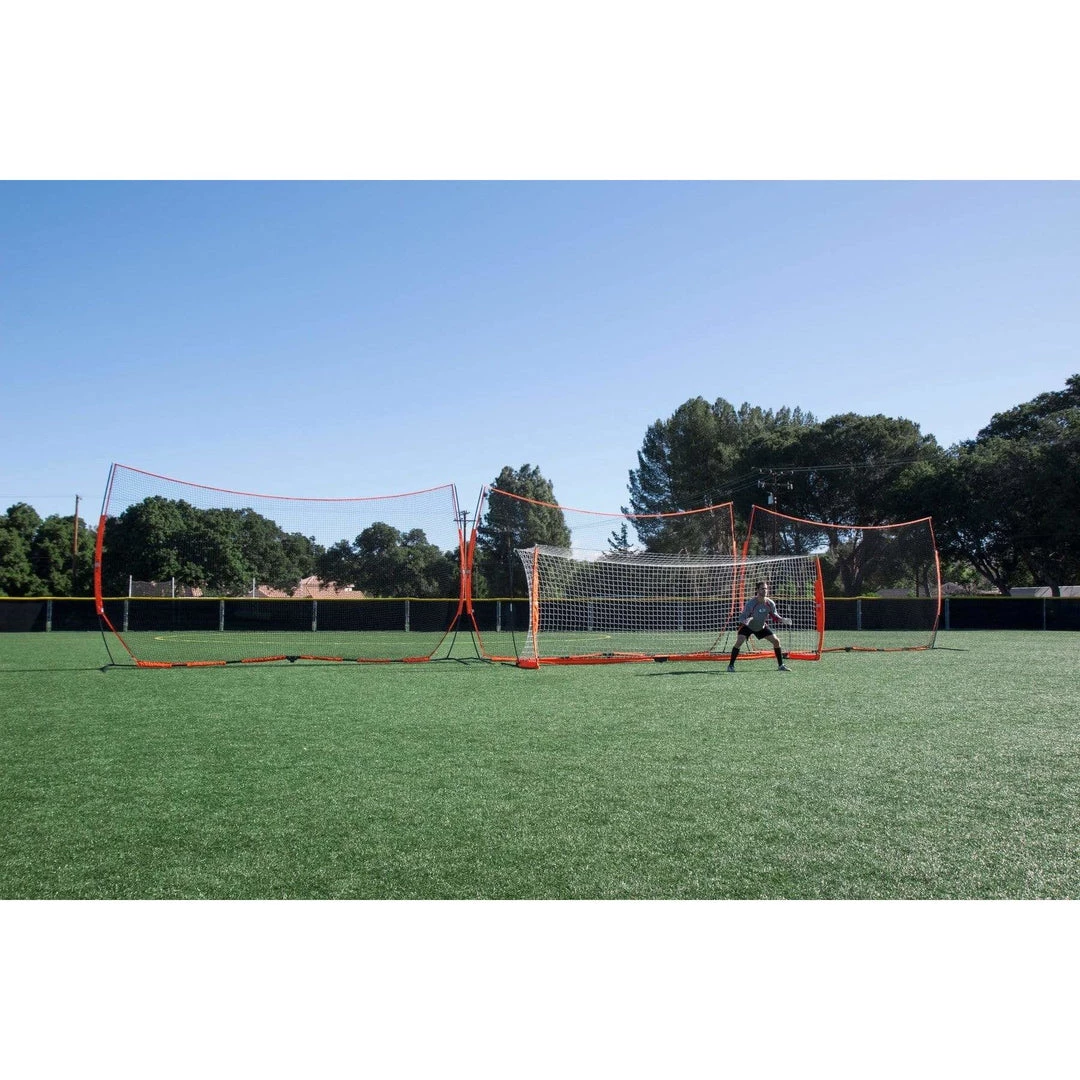 Improve safety and shared space on the field with Bownet’s Portable 21’6″ x 11’6″ Barrier Net. Reliability, portability, and strength make this barrier net the ideal choice for coaches, leagues, schools, parks, and facilities in managing shared spaces or shared sports in a confined area and blocking wide shots during a game or practice drill. Bownet’s Barrier Net is the perfect solution to stopping a missed pass from ruining another game or entering spectator stands. Set up the Portable Barrier net anywhere. When practice is over, collapse the net and place into the provided manageable roller bag for easy portability and storage.