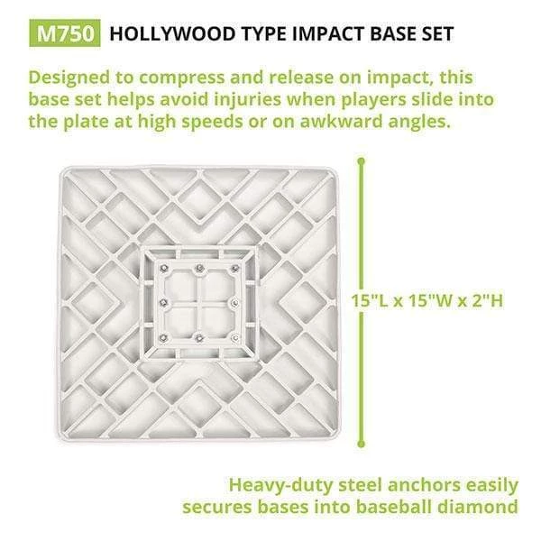 Ensure the safety of players in any baseball league with the Champion Sports Hollywood Type Impact Base Set. Designed to compress and release on impact, this base set helps avoid injuries when players slide into the plate at high speeds or on awkward angles. The heavy-duty rubber construction allows for maximum durability, making these bases perfect for any field.