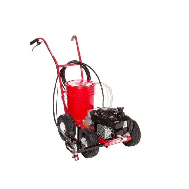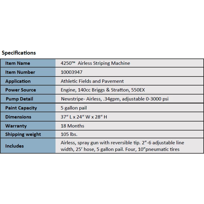 The Newstripe 4250 Airless Striping Machine is our most economical high pressure, airless pavement and athletic field marking machine. Weighing only 105 lbs., the 4250 shares many of the great features of the 4400 and 4600 SP Self-Propelled Airless Striping Machines, but with a more compact design and lightweight design. This makes it easy to push across the roughest athletic fields while producing bright and straight 2 inches to 6 inch wide lines. Plus, the 3000 psi adjustable pressure pump lets you spray perfect lines without wasting paint. Easy to use, handle-mounted controls let you quickly and efficiently stripe without time-consuming and costly setup.