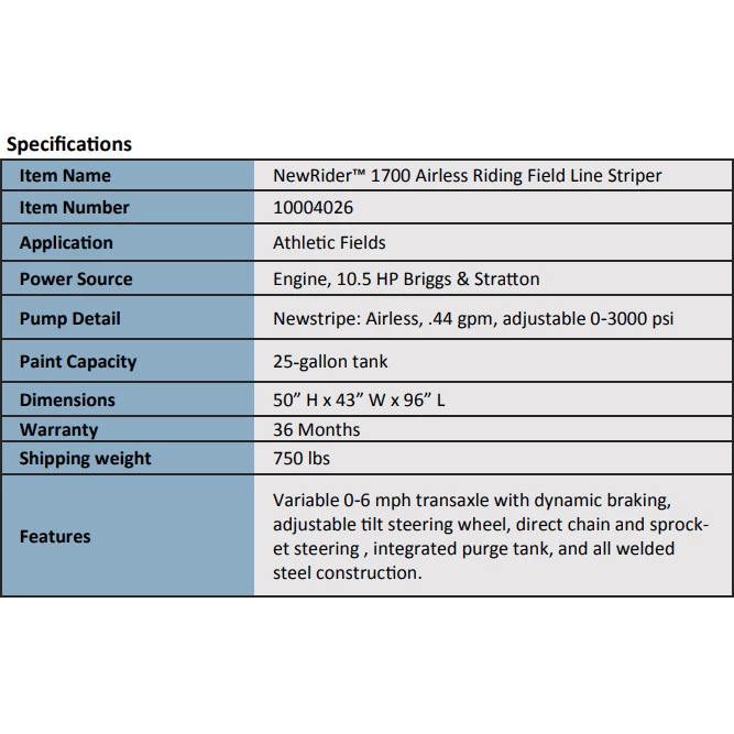 The NewRider 1700 Airless Riding Field Line Striper features: