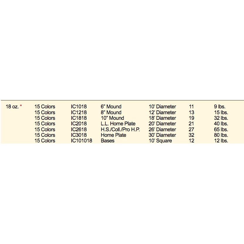 | 18oz Field Mound Protector Size Options | 18oz Vy.-6" Mound- 10' Diam., 18oz Vy.-8" Mound- 12' Diam., 18oz Vy.- 10" Mound – 18' Diam. |