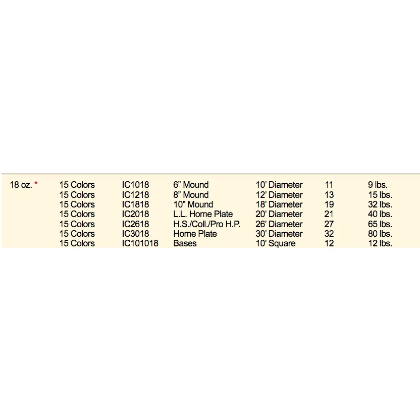 | 18oz Home Plate Protector Size Options | 18oz Vy.- L L HOME PLATE – 20' Diam., 18oz Vy.- 26' Dia. HS- COLL-PRO HOME PLATE, 18oz Vy.- Home Plate – 30' Diam. |