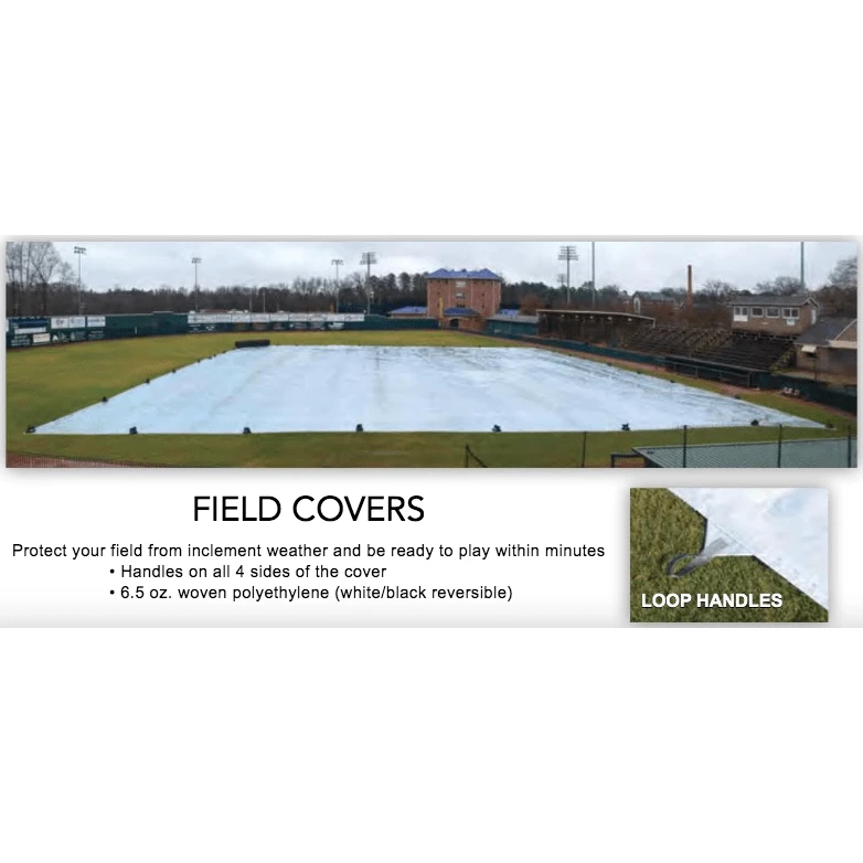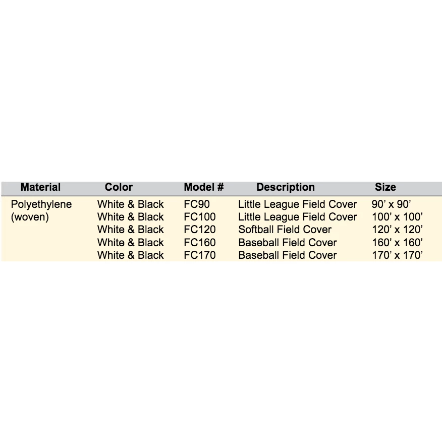 | Full Field Protection Cover Size Options | Little League Field Cover / 6.3 oz./ 90’ x 90’, Little League Field Cover / 6.3 oz./ 100’ x 100’, Softball Field Cover / 6.3 oz./ 120’ x 120’, Baseball Field Cover / 6.3 oz./ 160’ x 160’, Baseball Field Cover / 6.3 oz./ 170’ x 170’ |