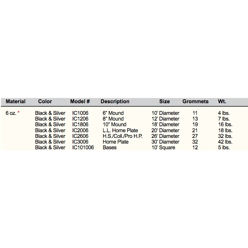 | 6oz Home Plate Protector Size Options | 6oz POLY- L L HOME PLATE – 20' Diam., 6oz POLY- 26' Dia. HS-COLL-PRO HOME PLATE, 6oz POLY- Home Plate – 30' Diam. |