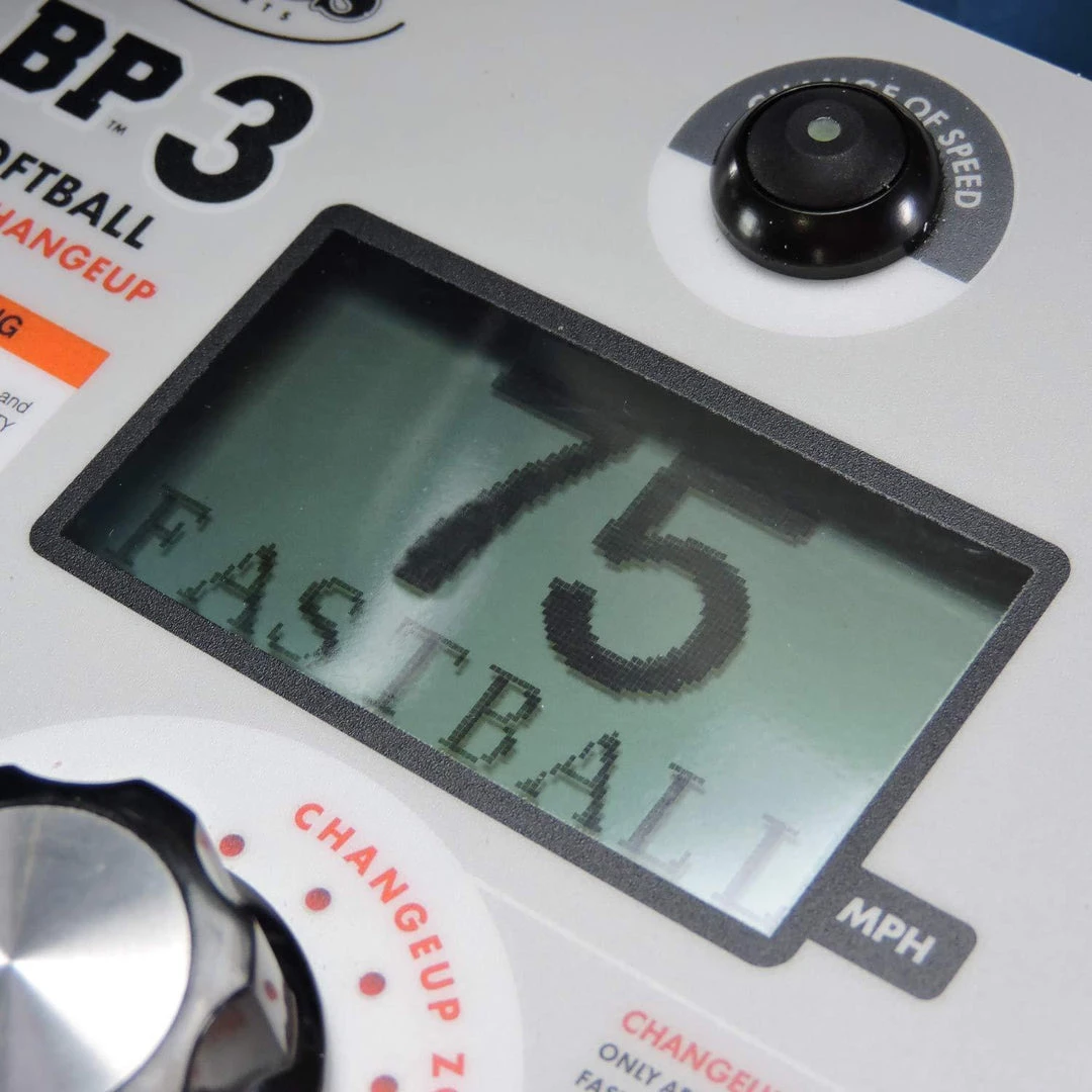 CHANGE FROM FASTBALL TO CHANGEUP AT THE TOUCH OF A BUTTON – The BP3 softball 3 wheel pitching machine throws changeups using the remote control on a key chain or manual button located on the control panel. 45-75 MPH SPEED RANGE – The BP®3 has a large 3″ LCD display. You set the digital speed you desire by simply turning a knob.