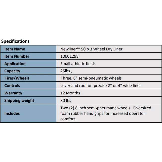 The NewLiner 50lb 3 Wheel Dry Liner features: 1. Loop handle with grips for better control 2. Galvanized steel material containers to prevent rusting. 3. Six-blade paddle for consistent lines 4. Original American made infield chalker.