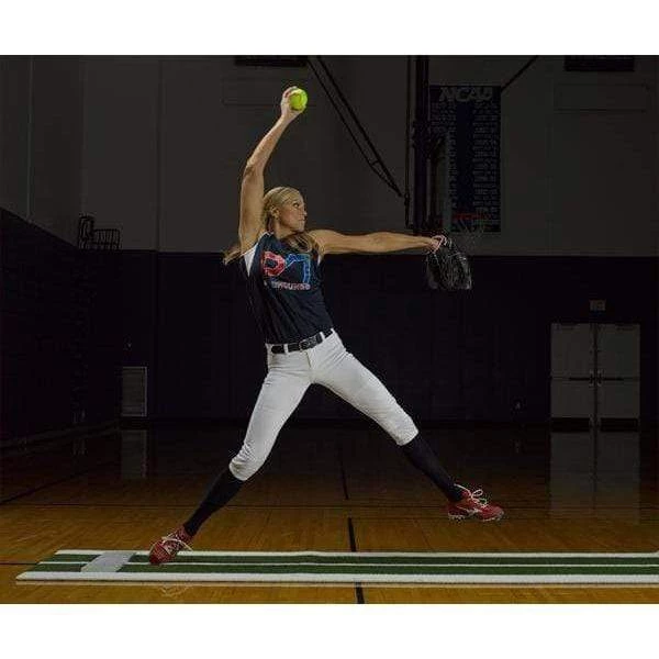 All Jennie Finch softball pitching mats come with our non-slip backing, keeping your mat from moving during indoor training. The mat includes a carrying case. Dimension: 3’W x 10’L.