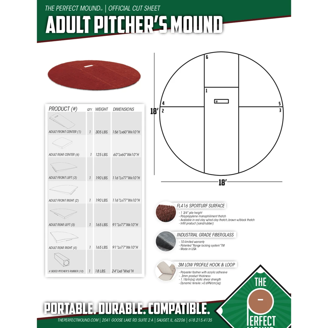 Simply the Best for High School, College, and Professional Baseball – The Perfect Mound Adult Model is engineered to meet major league specifications. The portable pitcher’s mound is constructed of reinforced fiberglass which is engineered for unlimited play. The 18′ adult portable pitching mound model is made up of six individual pieces that easily interlock to complete the entire mound. These individual pieces allow for the pitching mound to be portable and a baseball field can be transformed into any playing field desired.