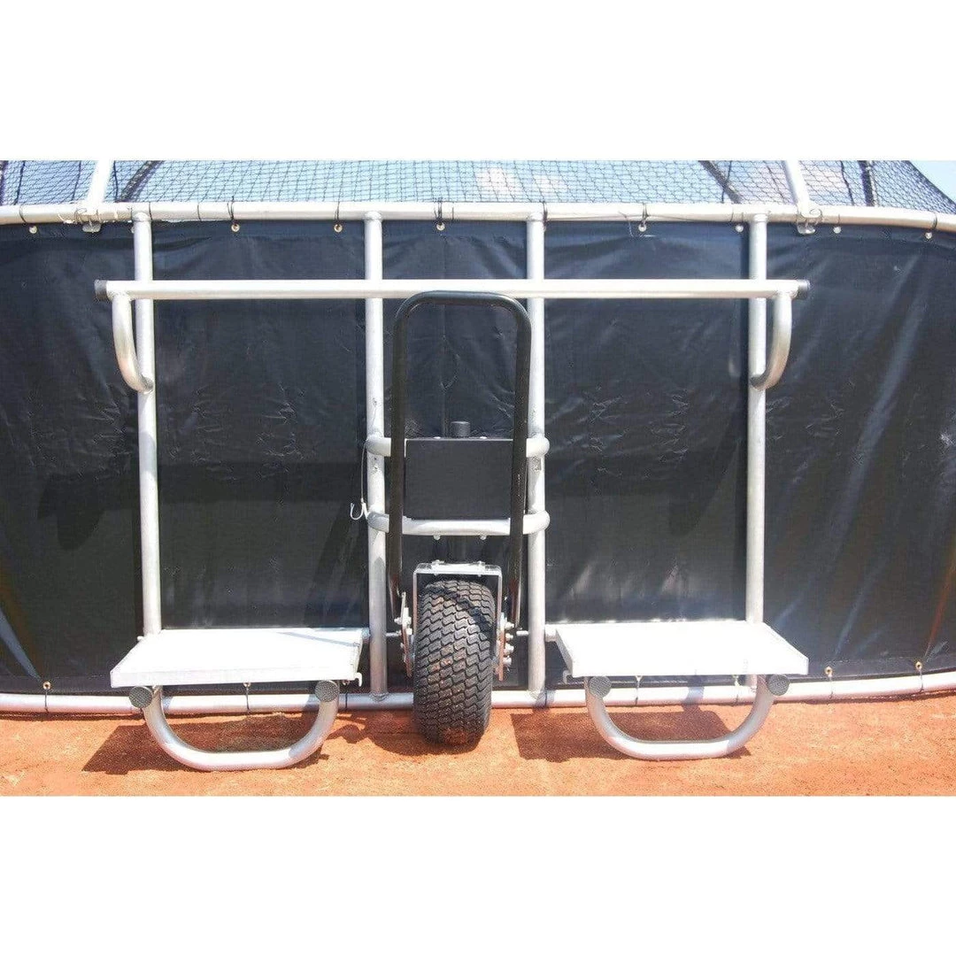 Designed for use by high school, collegiate, and professional programs. The frame structure is 2” aluminum tubing with heavy-duty weather-treated knotless netting and a solid vinyl black skirt. A large thud pad and baffle net protect the rear of the cage. Outer wheels turn 180 degrees and feature locking hubs with turf tires. Rear dolly assembly easily lifts and maneuvers cage. Padded rib bars feature welded placement guides for inserting lifting bars to safely raise the cage. Lifting bars secure to ribs with safety cable and pin. Dual, folding observation decks at the rear of the cage allow for raised viewing of the batter.